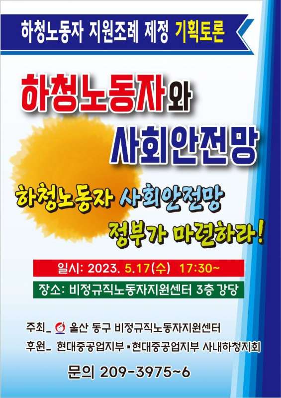 2023년 5월 17일 울산동구비정규직노동자지원센터에서는 "하청노동자와 사회안전망"이라는 주제로 토론회가 진행되었다. 이날 토론회는 울산 동구 하청노동자 지원조례 제정 기획토론으로 현대중공업지부 사내하청지회 윤용진 사무장이 "하청노동자와 사회안전망의 필요성"에 대해 주 발제를 진행했다.