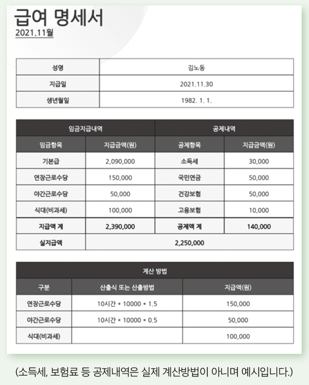 1. 실제 받은 월급 초과근무수당, 식대, 4대 보험료 등 모두 포함한 임금